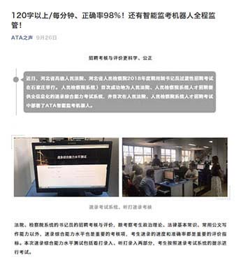 監(jiān)考機器人已成功服務了多次大規(guī)模考試,服務對象包括“全國稅務師職業(yè)資格考試”,“全國專利代理人資格考試”,“銀行專業(yè)人員職業(yè)資格考試”,“人民檢察院系統(tǒng)人才招聘考試”,以及“ACT(香港考點)”等等,廣受好評。